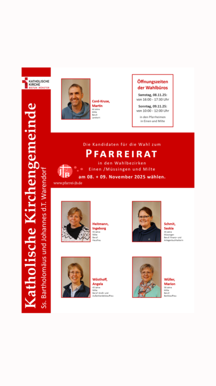 In Ss. Bartholomäus & Johannes der Täufer sollen künftig 12 Personen dem Pfarreirat angehören. Für den Pfarreirat kandidieren können Katholikinnen und Katholiken aus Einen-Müssingen und Milte, die mindestens 16 Jahre alt sind.
