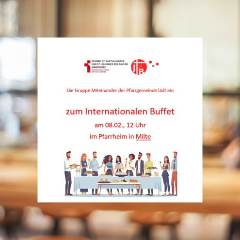 Die Gruppe Miteinander der Pfarrgemeinde lädt zum Internationalen Buffet am 08.02.26, 12 Uhr, ins Pfarrheim in Milte ein. Jede/jeder bringt eine Speise aus dem Heimatland mit. So ist es eine gute
