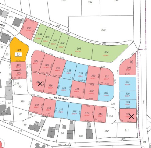 Neun Erbbaugrundstücke der katholischen Kirchengemeinde Ss. Bartholomäus & Johannes der Täufer sind im Baugebiet Königstal 2 in Warendorf / Milte zu vergeben (im Bild blau markiert). Die Erschließung ist abgeschlossen und die Grundstücke sind baureif. Der Bodenwert liegt bei 115€/m2 und der Erbbauzins liegt bei 4%. Bei Eigennutzung reduziert sich der Erbbauzins auf 3%. Damit ergeben sich jährliche Kosten bei Eigennutzung von 3,45€/m2.